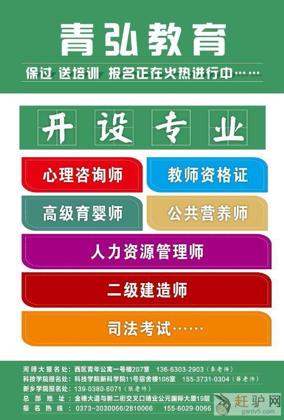 选择青弘教育,让您的职业生涯锦上添花。我校开有国家心理咨询师,人力资源管理师,公共营养师,教师资格证(包括幼儿园 小学,初中,高中),物业管理师等项目。同时还有一级建造师,二级建造师,一级消防工程师,造价工程师,监理工程师,注册招标师,环评工程师等工程类项目。g a n l v 5 c o m